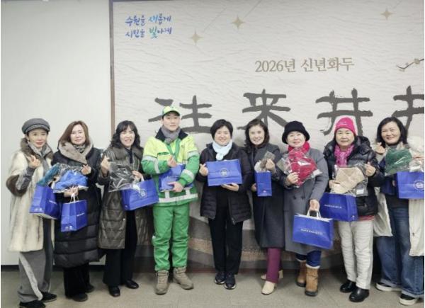 [한국제일신문, 김성옥기자] 수원 어울림헤라봉사회는 지난 29일, 겨울철 추운 날씨 속에서 지역의 쾌적한 환경을 위해 애쓰고 있는 환경관리원들의 노고를 격려하기 위해 따뜻한 격려 물품을 전달했다.