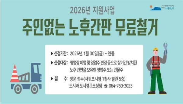 [한국제일신문, 김성옥기자] 서귀포시는 안전하고 쾌적한 도시경관 조성 및 소상공인의 경영 안정을 도모하기 위해 30일부터 ‘2026년 주인없는 노후간판 무료철거 지원사업’ 대상자를 연중 모집한다.