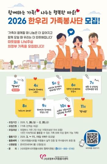 [한국제일신문, 김성옥기자] 의정부시자원봉사센터는 지난 1월 26일부터 의정부시 가족 단위 자원봉사 활성화를 위해 2026년 신규 ‘한우리 가족봉사단’ 모집을 시작했다.