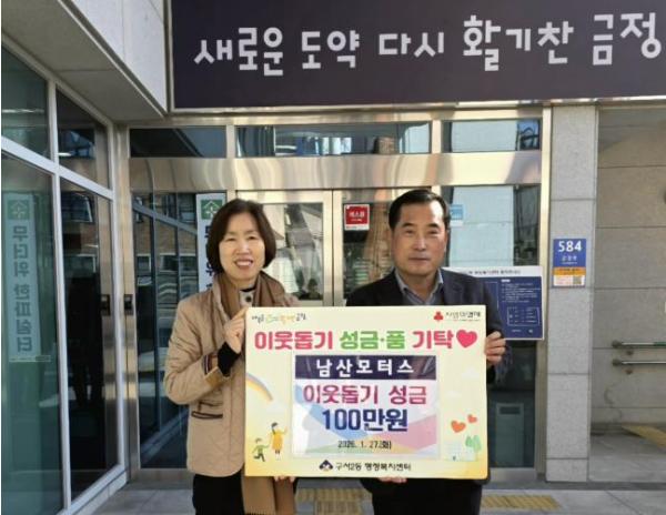 [한국제일신문, 김성옥기자] 부산 금정구 구서2동은 지난 27일 (주)남산모터스에서 이웃돕기성금 100만 원을 기탁했다고 밝혔다.