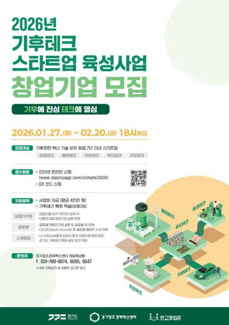 지원 대상은 기후 관련 혁신 기술을 보유한 창업 7년 내 스타트업으로, 2월 20일 오후 6시까지 필요 서류를 갖춰 온라인 신청 하면 된다.