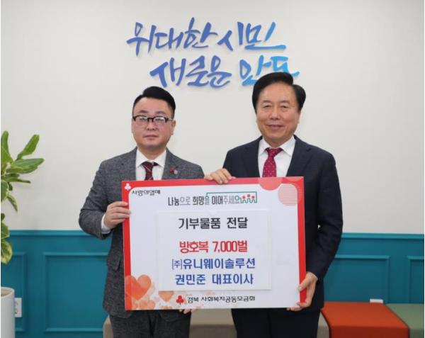 안동시는 1월 28일 시장실에서 권기창 안동시장과 ㈜유니웨이솔루션 권민준 대표이사가 참석한 가운데, 2026년 여름철 현장 작업자들의 안전을 위한 방호복 7,000벌 기탁식을 가졌다고 밝혔다.