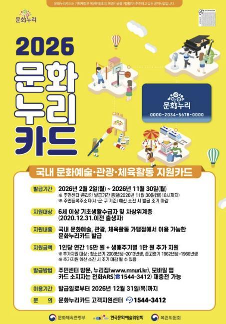 신청은 2026년 2월 2일부터 11월 30일까지 가능하며, 주소지 읍·면사무소 방문 접수는 물론 문화누리카드 공식 누리집과 모바일 앱을 통해서도 간편하게 신청할 수 있다. 단, 사업 예산이 소진될 경우 접수가 조기에 마감될 수 있다.