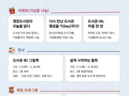 전시 프로그램으로는 2월 3일부터 24일까지 1층 로비에서 ‘100 인생 그림책’ 원화 전시를, 2월 3일부터 28일까지 3층 종합자료실에서 철학 입문 도서 북큐레이션 ‘쉽게 시작하는 철학’을 선보인다.