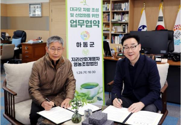 하동군은 지난 29일 오후 2시, 군수 집무실에서 지리산화개명차영농조합법인(대표 김민구)과 ‘대규모 차밭 조성 및 산업화를 위한 업무협약(MOU)’을 체결했다고 밝혔다.
