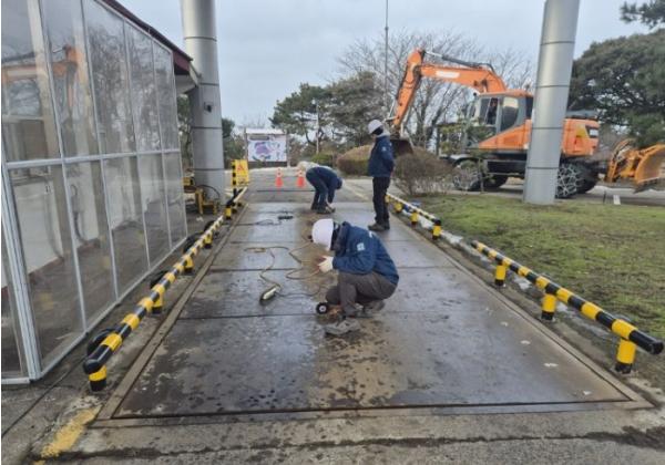 이번 수리작업은 지난 1997년부터 사용한 계근대의 노후에 따른 개선 공사로 부식된 받침틀(25개) 교체 및 상부 철판(6개)용접 등을 실시하여 안전사고 우려를 해소했다.