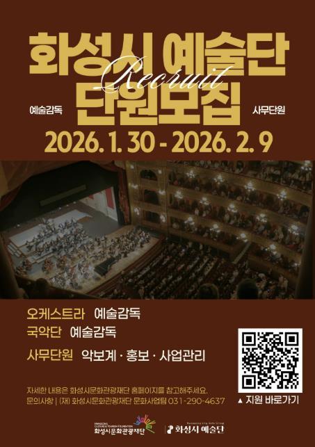 (재)화성시문화관광재단은 2026년 ‘화성시 예술단’을 이끌어갈 예술감독과 사무단원을 모집한다.