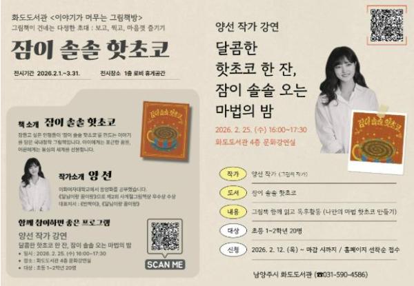 프로그램은 그림책 공간전시와 작가 강연으로 구성되며, 전시는 화도도서관 1층 로비에서 운영돼 남양주시민 누구나 자유롭게 관람할 수 있다.