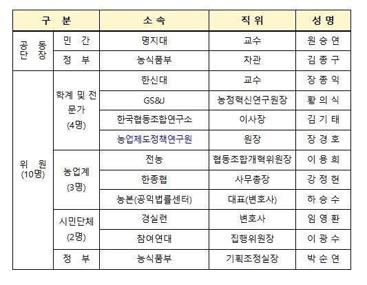 ‘농협 개혁 추진단’은 명지대 원승연 교수와 농식품부 김종구 차관이 공동단장을 맡는 민·관 합동 논의기구로, 농업계와 시민사회 분야, 협동조합·금융·법률 분야의 전문성을 갖춘 12명의 위원(단장 포함)으로 구성됐다.
