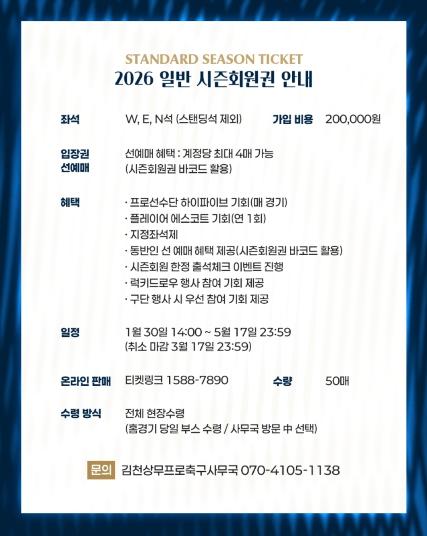 김천상무프로축구단(대표이사 이재하)이 1월 30일 14시부터 시즌회원, 어린이 시즌회원, 티켓북 판매를 시작했다.