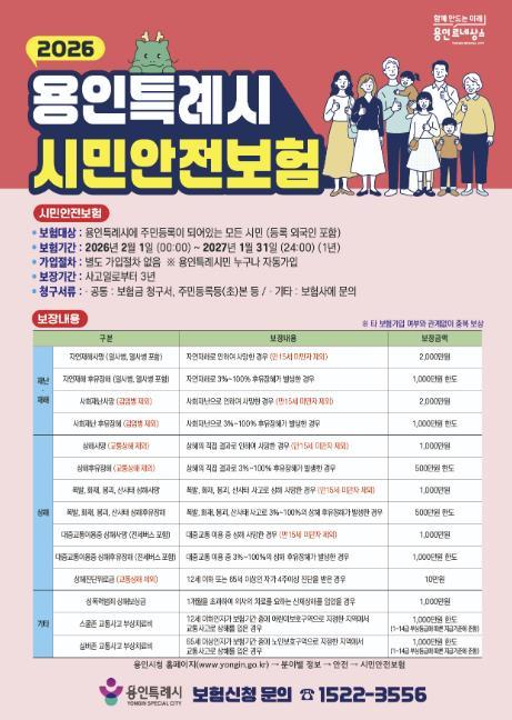 시민안전보험은 주민등록법상 용인에 주소를 둔 시민(등록외국인, 외국국적동포 국내거소신고자 포함)이라면 누구나 별도의 가입 절차나 비용 부담 없이 보장을 받을 수 있는 제도다.