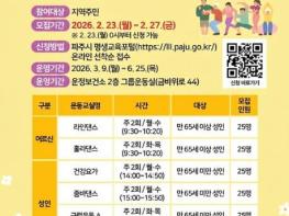 [한국제일신문, 김성옥기자] 파주시 운정보건소는 지역 주민의 건강 증진과 신체활동 실천을 돕기 위해 2026년 상반기 ‘순환 운동교실’과 ‘그룹 운동교실’참여자를 모집한다.