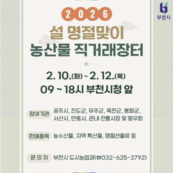 이수미 부천시 도시농업과장은 “이번 직거래장터는 설 명절을 앞두고 시민들이 전국의 다양한 농특산물을 한자리에서 만날 수 있도록 마련한 자리”라며 “가격 부담은 줄이고 명절의 따뜻한 정취는 더할 수 있도록 준비한 만큼, 많은 시민이 함께 즐기길 바란다”고 말했다.