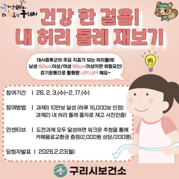 [한국제일신문, 김성옥기자] 구리시는 시민의 대사증후군 예방과 건강 인식 제고를 위해 ‘건강 한 걸음! 내 허리둘레 재보기’ 챌린지를 2월 3일부터 2월 17일까지 15일간 운영한다고 밝혔다.