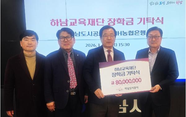 [한국제일신문, 김성옥기자] 하남교육재단은 29일 하남시청에서 하남도시공사로부터 하남시 미래인재육성을 위해 장학금과 캠퍼스투어 운영을 위한 기부금 8천만 원을 전달받았다.