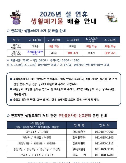 시 관계자는 “설 연휴 기간 생활쓰레기 처리에 차질이 없도록 대응 체계를 운영하겠다”며 “시민 여러분께서도 올바른 분리배출과 쓰레기 배출량 줄이기 실천에 협조해 주시기 바란다”고 말했다.
