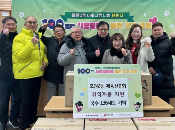 [한국제일신문, 김성옥기자] 의정부시 호원2동주민센터는 1월 30일 호원2동 체육진흥회가 설 명절을 맞아 지역 내 어려운 이웃을 위해 국수세트 136개를 기탁했다고 밝혔다.
