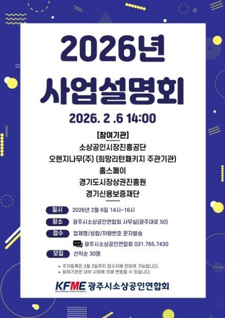 [한국제일신문, 김성옥기자] 광주시소상공인연합회는 지역 소상공인을 대상으로 2026년도 주요 정책과 지원사업을 안내하는 사업설명회를 개최한다고 3일 밝혔다.