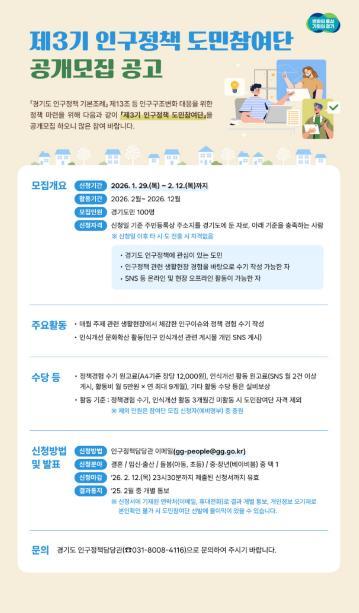 [한국제일신문, 김성옥기자] 경기도가 정책 대상자가 직접 정책개선에 참여하는 ‘제3기 인구정책 도민참여단’ 100명을 공개 모집한다.