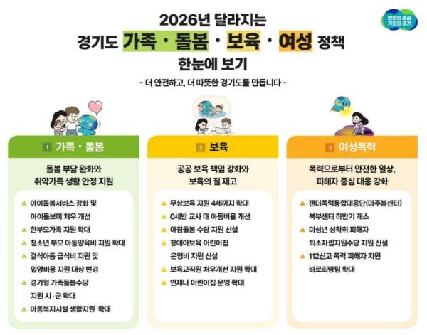 박연경 경기도 여성가족국장은 “이번 제도 개선은 단순한 혜택 확대를 넘어, 생애주기에 맞춘 체계적인 지원체계 구축에 방점이 있다”며 “경기도는 누구도 돌봄과 복지에서 소외되지 않도록 더욱 세심하고 실질적인 정책을 펼쳐나가겠다”고 말했다.
