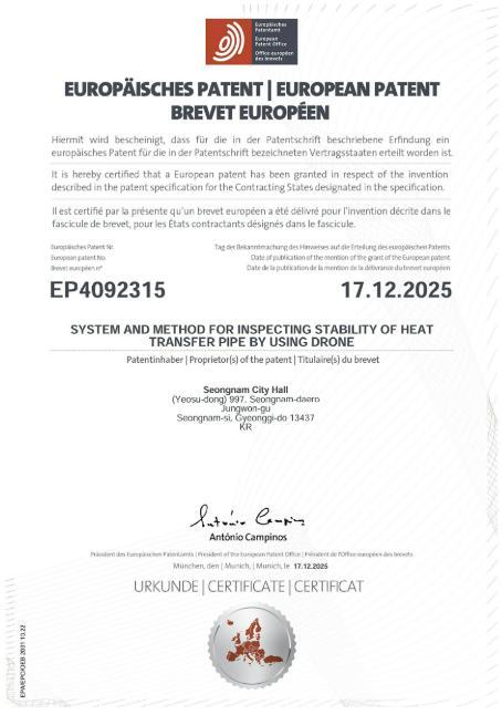 [한국제일신문, 김성옥기자] 성남시가 자체 개발한 ‘드론을 이용한 열수송관 안정성 검사 시스템’이 유럽특허(등록번호 EP4092315) 등록을 완료했다고 밝혔다. 이는 시 최초의 해외특허 등록 사례로, 지식재산의 해외 권리화를 통해 유럽 수출길을 여는 계기가 될 것으로 기대된다.