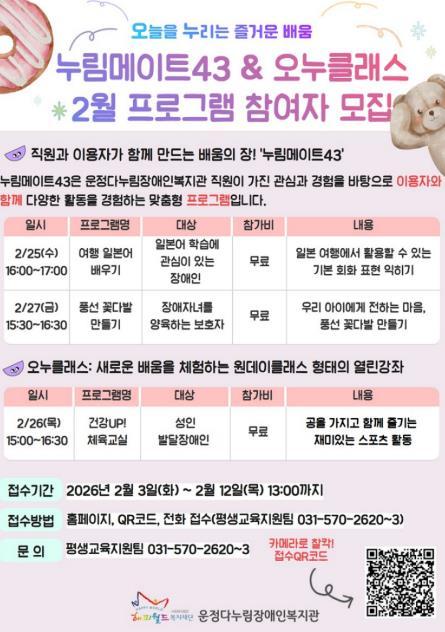 [한국제일신문, 김성옥기자] 파주시 운정다누림장애인복지관은 참여형 평생학습 프로그램 ‘누림메이트43’을 운영하며, 정규 강좌로는 담기 어려운 소규모 학습 수요를 반영한 생활 밀착형 배움을 실천하고 있다.