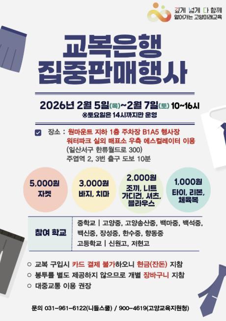 [한국제일신문, 이양섭기자] 경기도고양교육지원청은 관내 중·고등학교 졸업생의 교복 물려주기 일환으로 교복은행 집중판매 행사를 2월 5일부터 7일까지 3일간 고양 원마운트에서 진행한다고 밝혔다.