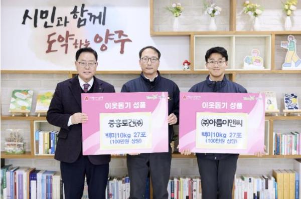 [한국제일신문, 임하종기자] 양주시가 지난 3일 시장실에서 중흥토건㈜과 ㈜아름이앤씨로부터 이웃돕기 성품으로 백미 10kg 54포(200만 원 상당)를 기탁받았다.