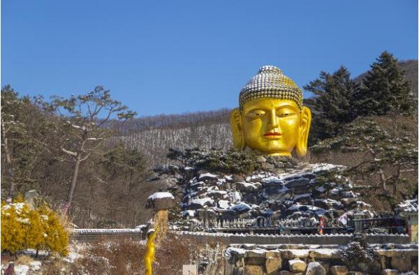 와우정사는 사방이 산으로 둘러싸인 사찰이다. 그럼에도 주차장과 사찰이 바로 연결되어 있어서 산속 사찰치고는 접근성이 매우 좋다. 눈이 내린 날에도 부담 없이 방문할 수 있는 곳이다. 사찰 입구에 들어서면 가장 먼저 눈에 띄는 건 황금빛 부처님 얼굴, 대형 불두(佛頭)다. 황금빛 불두의 높이는 무려 8m다. 전통 사찰에서는 거의 보기 어려운 풍경이 신비롭지만 아직 놀라기에는 이르다. 불두를 뒤로하고 언덕을 오르자면 좌측으로 여러 개의 돌탑이 세워져 있는데 이 모습 또한 매우 독특하다. 돌을 쌓아서 만든 탑이라기보다는 돌을 붙여서 세운 탑처럼 보인다. 사용한 돌의 모양도 둥글둥글해서 이색적이지만 방향 역시 탑의 형태에 따라 가로와 세로로 쌓아 하나의 예술작품처럼 보인다. 언덕을 오르다 보면 네팔 사원을 그대로 옮겨 놓은 듯한 전각도 보인다. 그리고 언덕 정상에는 황금빛 지붕의 건물 하나가 있는데 이곳에 12m 길이의 와불이 모셔져 있다. 인도네시아에서 가져온 통 향나무를 깎아서 만든 이 부처님은 은은한 빛을 받으며 누워 있는 모습이 매우 신비로운 분위기를 만든다.