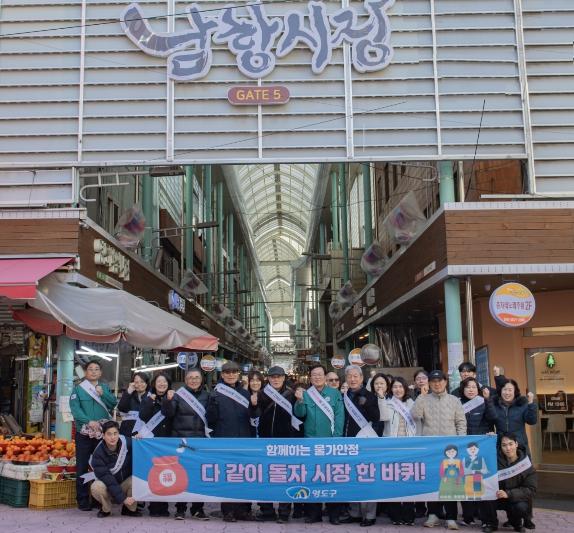 이날 행사에는 영도구청장을 비롯해 절영상공인연합회, 상인회 관계자, 공무원 등 20여 명이 참여해 전통시장 이용 및 물가 안정 캠페인을 실시한 뒤 직접 장을 보며 상인들과 소통하고 현장의 애로사항을 청취했다.