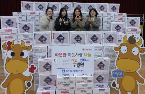 [한국제일신문, 김성옥기자] 수병원은 지난 4일, 설 명절을 맞아 어려운 이웃들을 위해 라면 200박스를 우만1동 행정복지센터에 기부하며 이웃사랑을 실천했다.