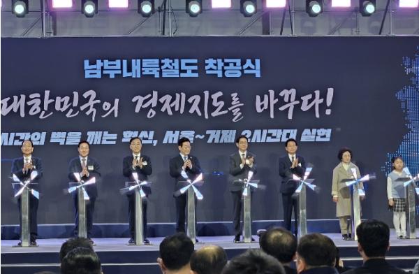 이날 착공식은 대통령, 국토교통부 장관, 경상북도지사, 경상남도지사, 지역 국회의원, 경유 지자체장, 지역 주민 등이 참석한 가운데 경남 거제시 둔덕면 일원에서 개최됐다.