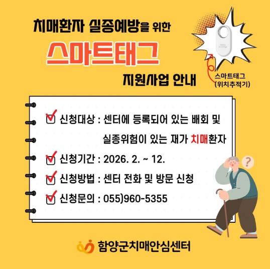 함양군치매안심센터 관계자는 “스마트태그 지원사업은 어르신들의 실종을 예방하고 조속한 발견과 복귀를 지원하여 치매 환자 가족의 불안을 줄이고 보호 부담을 완화하는데 의미가 있다”라고 말했다.