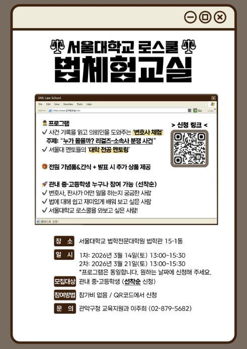 이번 법체험 교실은 3월 14일과 21일 두 차례 서울대학교 법학전문대학원에서 운영된다. 참여를 희망하는 관내 중‧고등학생은 오는 3월 3일부터 10일까지 홍보 포스터의 QR코드를 통해 개별 신청하면 된다.