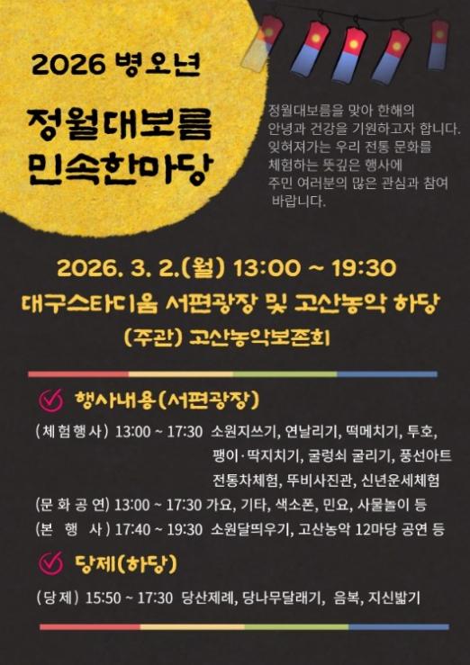 [한국제일신문, 김성옥기자] 대구 수성구는 2026년 병오년을 맞아 정월대보름을 하루 앞둔 다음 달 2일 대구스타디움 서편광장에서 고산농악보존회 주최·주관으로 구민의 안녕을 기원하는 ‘정월대보름 민속 한마당’을 개최한다.