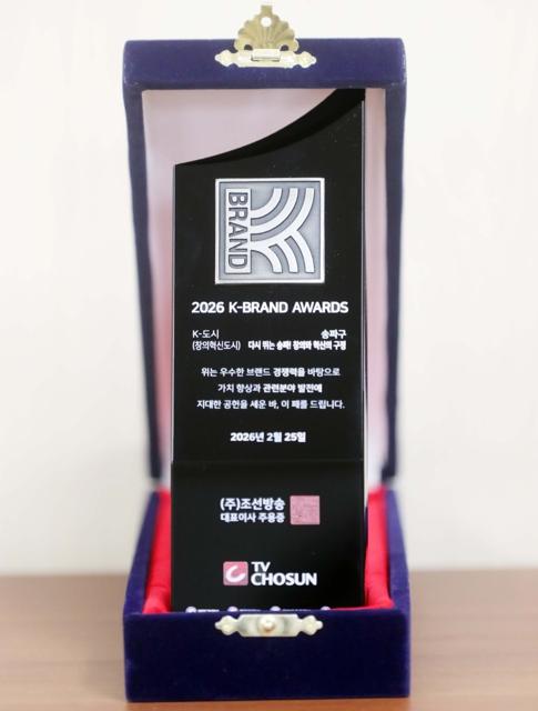 [한국제일신문, 김성옥기자] 서울 송파구가 25일 서울 더플라자호텔에서 열린 ‘2026 TV조선 K-브랜드 어워즈’ 시상식에서 K-도시(창의혁신도시) 부문 대상을 수상했다.