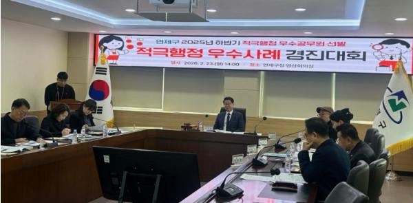 [한국제일신문, 김성옥기자] 연제구는 2월 23일, 공직사회 내 적극행정 문화를 확산하고 주민이 체감할 수 있는 행정 혁신 성과를 공유하기 위해 ‘2025년 하반기 적극행정 우수사례 경진대회’를 개최하고 총 4건의 우수사례를 최종 선정했다.