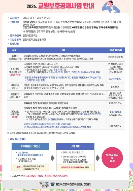 [한국제일신문, 김성옥기자] 충청북도교육청은 교원이 안심하고 교육활동에 전념할 수 있도록 2026년 교원보호공제사업의 보장 범위를 확대해 시행한다고 밝혔다.