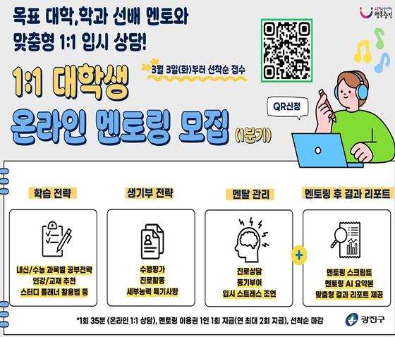 [한국제일신문, 김성옥기자] 광진구가 고교학점제 개편 등 변화하는 입시 환경에 대응하기 위해 관내 중고등학생을 대상으로 ‘1:1 대학생 온라인 멘토링’을 3월부터 12월까지 상시 운영한다.