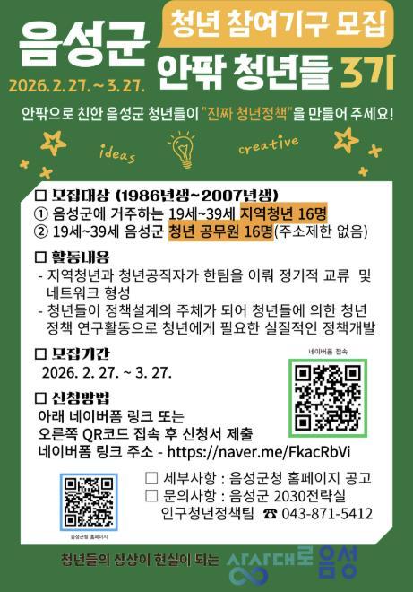 모집인원은 19세 이상 39세 이하 지역청년 16명과 음성군 소속 청년공무원 16명이다.