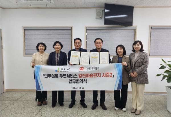 [한국제일신문, 윤진성기자] 강진군이 작년에 이어 올해에도 행정안전부 공모사업 ‘2026년 읍면동 스마트 복지‧안전서비스 개선 모델 개발 지원사업’의 ‘안부살핌 우편서비스’ 부문에 선정돼 국비 1천만 원과 우체국공익재단 8백만 원을 포함한 총 2천 8백만 원 규모의 예산을 투입해 촘촘한 복지 안전망 구축에 나섰다.
