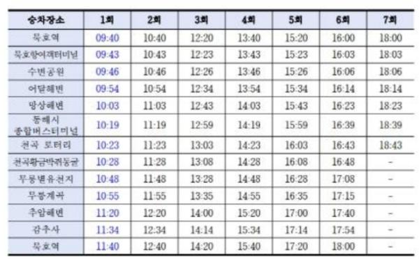 이에 따라 3월 7일부터는 묵호역 기준 오전 9시 40분에 1회차 운행이 시작되며, 수변공원, 망상해변, 무릉별유천지 등 주요 거점 정류장의 도착 시간도 10분씩 빨라진다.