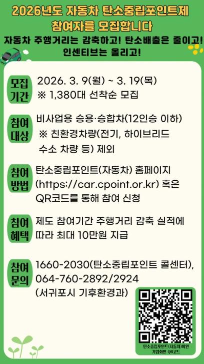 [한국제일신문, 김성옥기자] 서귀포시는 3월 9일부터 3월 19일까지 수송부문 온실가스 감축 프로그램인 자동차 탄소중립포인트제 참여자 1,380명을 선착순 모집한다고 밝혔다.
