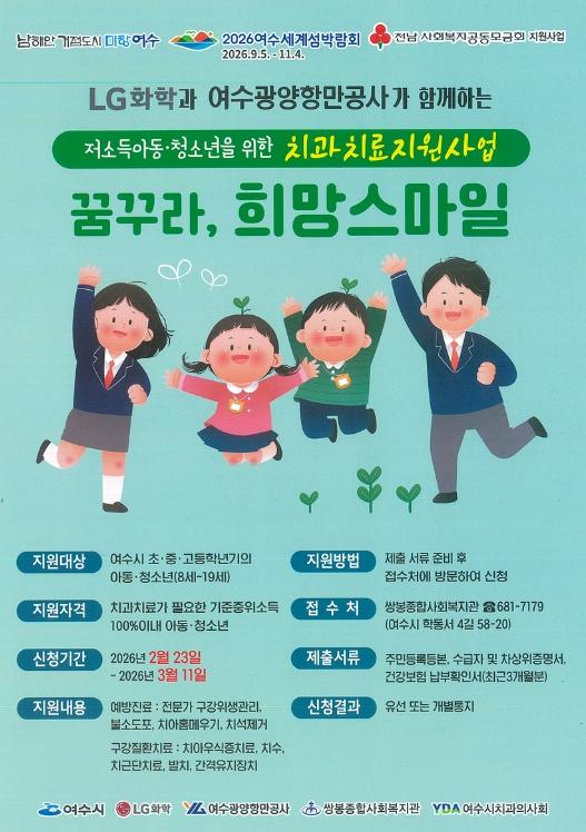 [한국제일신문, 윤진성기자] 여수시는 민·관이 협력해 저소득 아동·청소년의 구강건강 증진을 위한 치과치료 지원사업 '2026 꿈꾸라, 희망스마일'을 추진한다고 밝혔다.