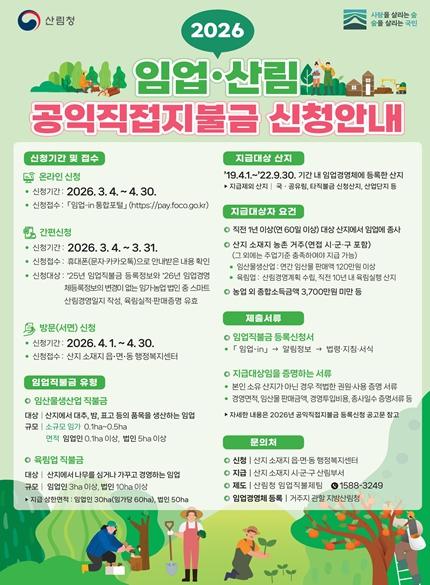 [한국제일신문, 김성옥기자] 강원특별자치도는 2026년 임업·산림 공익직접지불금 신청을 3월 4일부터 4월 30일까지 접수한다고 밝혔다.