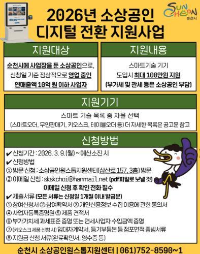 [한국제일신문, 윤진성기자] 순천시는 온라인 주문 확대와 비대면 소비 증가 등 디지털 환경 변화에 대응해 지역 소상공인의 경쟁력을 높이기 위한 ‘2026년 소상공인 디지털 전환 지원사업’을 본격 추진한다.