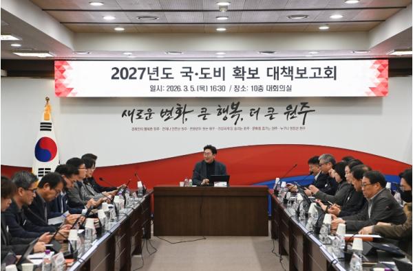 [한국제일신문, 김성광기자] 원주시가 내년도 국도비 예산 9,200억 원을 확보하기 위한 본격적인 행보에 나섰다. 시는 5일 오후 4시 30분, 시청 10층 대회의실에서 ‘2027년도 국도비 확보 대책보고회’를 개최하고, 핵심 현안 사업을 추진하기 위한 예산 확보 총력전에 돌입했다.
