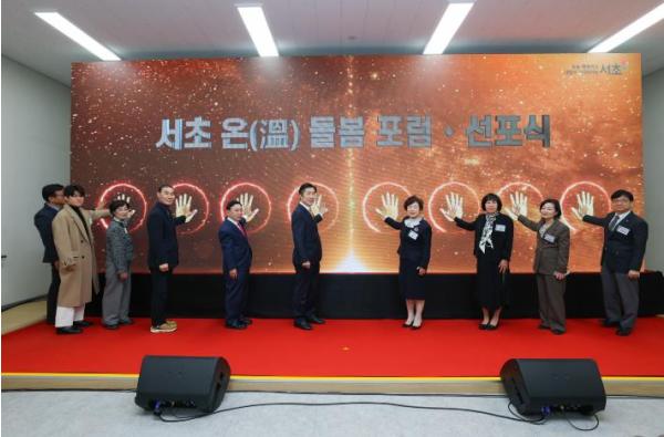 이날 행사는 사회복지기관 및 돌봄서비스 제공기관 관계자, 서초구민 등 약 200여 명이 참석한 가운데 1부 포럼과 2부 선포식으로 진행됐다. 1부 포럼에서는 인천대학교 사회복지학과 전용호 교수가 ‘통합돌봄법의 시행과 서초구 지역사회 변화’를 주제로 강연을 진행해 현장 실무자들과 통합돌봄 추진 방향을 공유했다. 이어 2부 선포식에서는 청년예술인 공연단의 식전 공연을 시작으로 사업 안내 영상 시청, 서초형 통합돌봄 비전 선포 퍼포먼스가 펼쳐졌다.