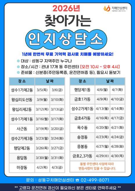 [한국제일신문, 김성옥기자] 서울 성동구 치매안심센터는 3월 5일부터 4월 30일까지 17개 동 주민센터를 순회하며 치매 조기 검진을 실시하는 ‘2026 찾아가는 인지상담소’를 운영한다고 밝혔다.