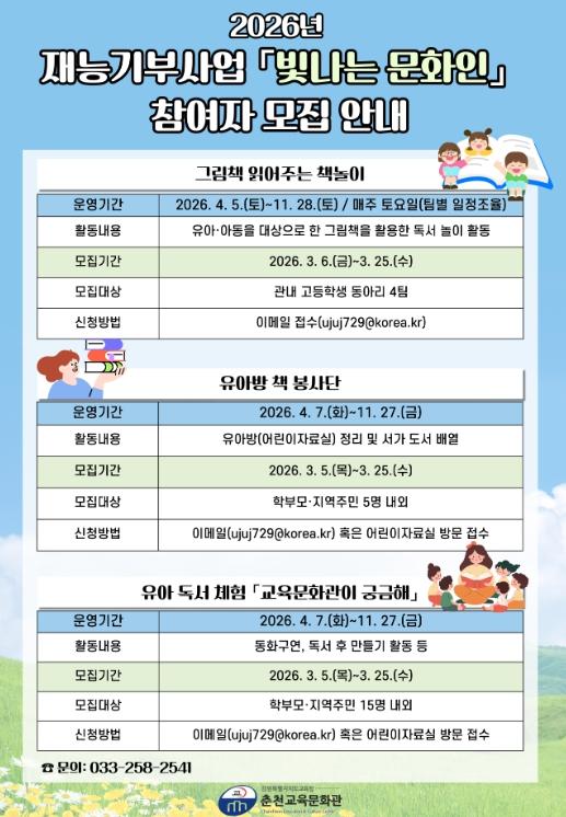 재능기부사업 '빛나는 문화인'은 △그림책 읽어주는 책놀이 △유아방 책 봉사단 △유아 독서 체험 ‘교육문화관이 궁금해’ 3개 분야로 운영되며, 참여자는 유아·어린이를 대상으로 독서 활동 지도, 도서 정리, 동화 구연 및 독서 체험 활동 등을 수행하게 된다.
